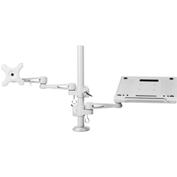 ノートパソコン台と27インチモニタを搭載できるモニターアームです。本製品を使用することでノートパソコンをデスクの上に置く必要が無くスペースを広く使うことが可能になります。またアームの留め部は分かれている為、ノートパソコンと液晶モニターの高さをそれぞれ調整することができます。さらに、ノートパソコン用アームは天板を取り外すことでモニターアームとしての使用もできます。