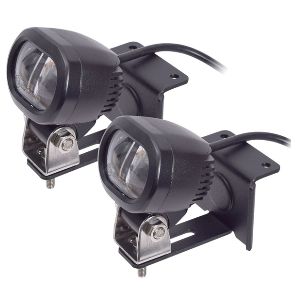 「フォークリフトセーフティLEDレーザー」の2個セットです。2個あることで、フォークリフトを囲むように左右や前後などにラインを出して、進入禁止領域を表示させることができるようになります。
