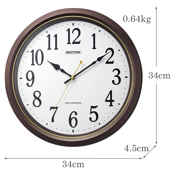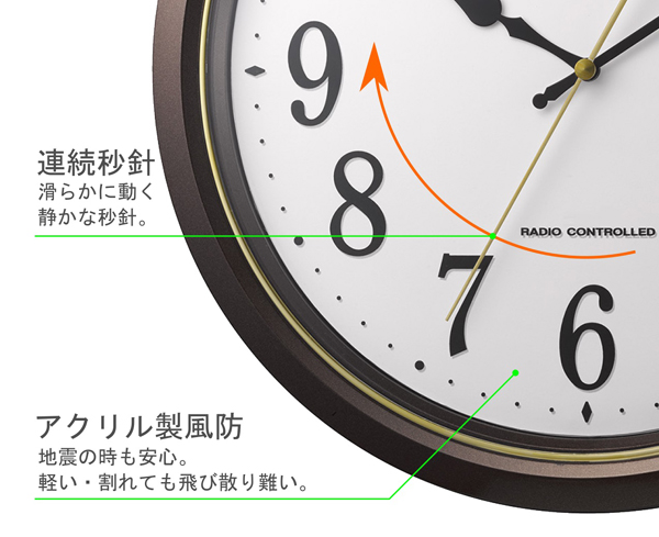 商品名 電波時計 掛け時計 連続秒針 直径34cm フィットウェーブ565 茶色