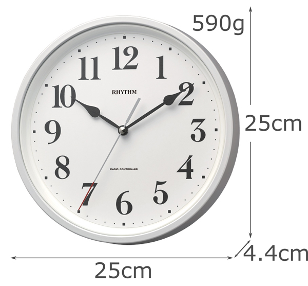 ●ムーブメント:電波時計。●連続秒針。●置き掛け兼用(置き用スタンド付属)。●使用電源:アルカリ単3形×1本。●配色:白。●材質:プラスチック枠、風防:ガラス。●サイズ:Φ250×44mm。●重量:580g。●名入れ:15×60mm(白)。●個包装:283×282×70mm(740g)。