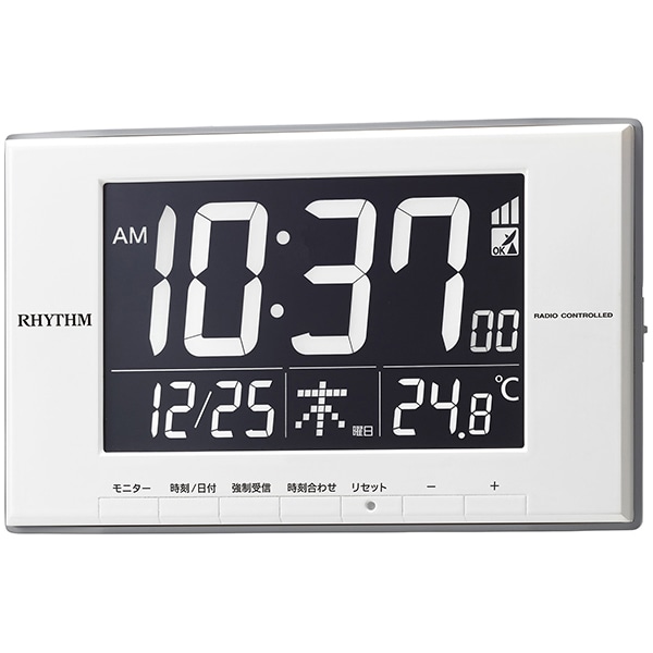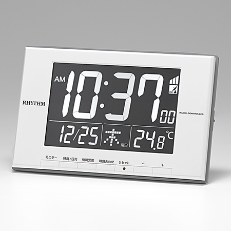 ●ムーブメント:電波時計。●電子音アラーム。●使用電源:AC電源、CR2032×1個。●配色:白。●材質:プラスチック枠。●サイズ:120×194×21mm。●重量:270g。●名入れ:40×60mm(グレー)。●温度表示(-9.9~50℃)。●カレンダー。●止めてもまた鳴る「スヌーズ機能」。●12/24時、表示切替可能。●時刻/カレンダー、メーン表示切替可能。