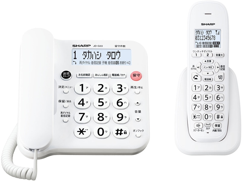 ●使いやすいシンプルなボタンレイアウトです。 ●親機、子機ともに、文字がくっきり見やすいホワイト液晶を採用しました。●出る前に相手を確認できる「お名前確認ボタン」●ワンタッチで撃退できる「迷惑ストップボタン」●子機1台同梱。