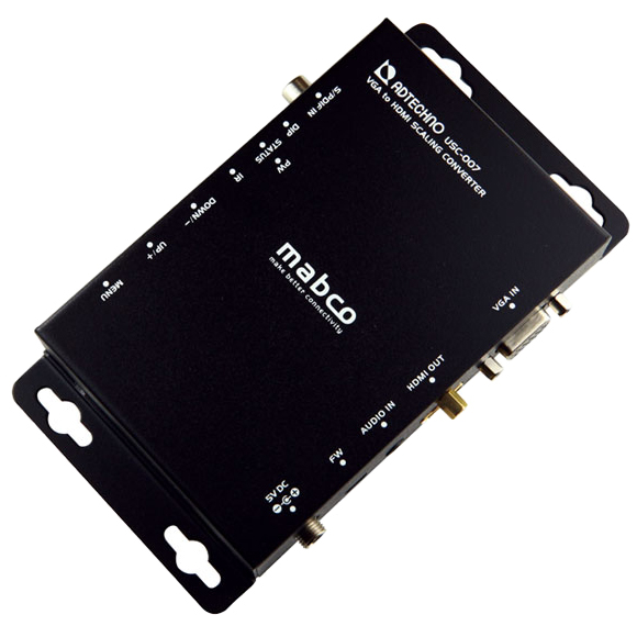USC-007はVGAのアナログ信号を最大1080p60(TV規格)、最大1920x1200(VESA規格)計36種類の任意解像度へスケーリング変換する他、アナログ音声またはデジタル音声をHDMIにエンベデッドして出力可能。表示する液晶モニターやプロジェクター等の表示フォーマットに合わせてHDMI信号出力が可能となります。
