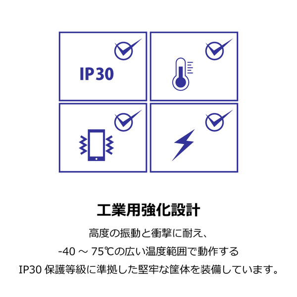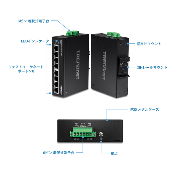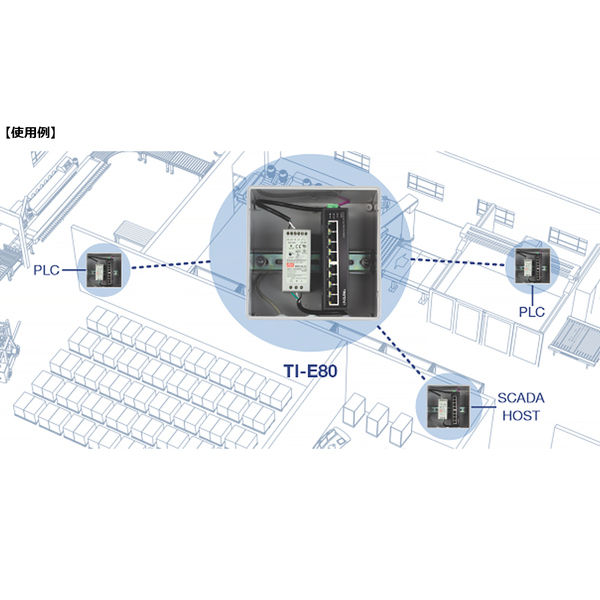 ●10/100Mbpsポート x8 ●IP30準拠の堅牢な金属製スイッチ ●動作温度範囲:-40~75℃ ●電源:入力12~56V DC ●冗長電源入力対応(過電流保護機能付き)●最大消費電力:3W ●外形寸法(LxWxH):142 x 105 x 37mm ●質量:486g ●パッケージ内容:TI-E80、クイックインストールガイド、着脱式6ピン端子台、DINレールキット、壁掛けキット ●準拠規格:IEEE 802.3、IEEE 802.3u、IEEE 802.3ab、IEEE 802.3x ●データバッファ容量:56KB●スイッチングファブリック:1.6Gbps●MACアドレステーブル:1Kエントリ●転送能力:1.19Mpps(64バイトパケット時)●ESD(静電気放電)耐性:8kV ●設置場所を選ばない省スペース設計 ●ファンレス設計で静音動作 ●電源障害時に動作するアラームリレー搭載●ハードウェアバージョン:Version v1.0R