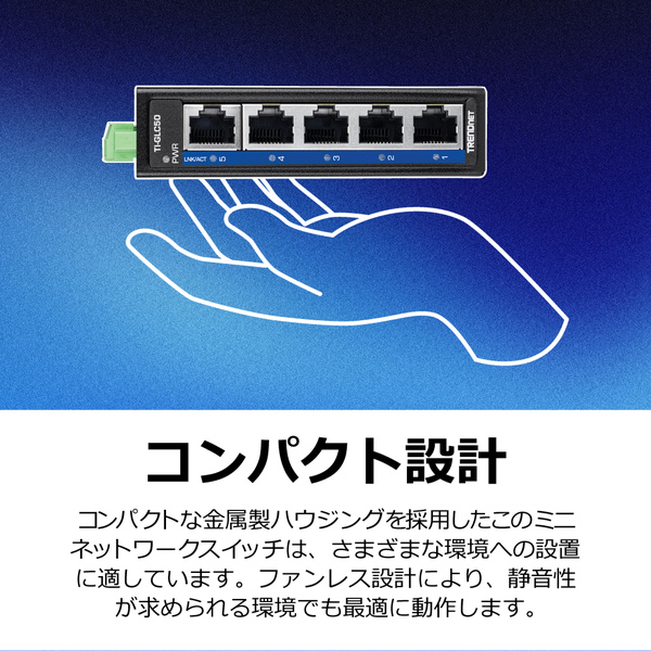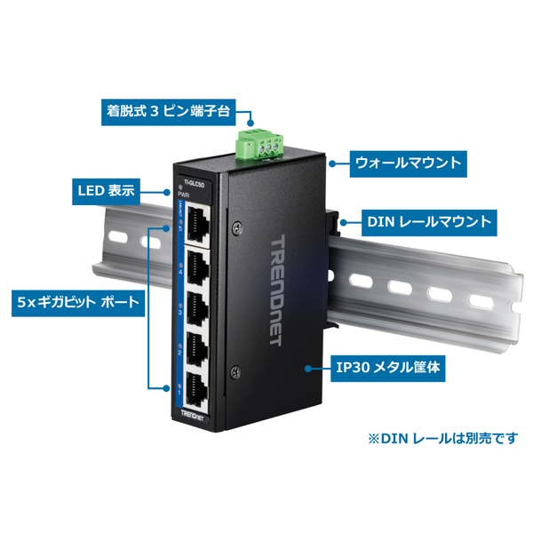 ●ギガビットポート x5 ●IP30準拠の堅牢な金属製スイッチ ●動作温度範囲:-40~75℃ ●電源:入力9.6~60V DC●最大消費電力:2.688W ●外形寸法(LxWxH):100.5 x 60 x 25.5 mm●質量:220g●パッケージ内容:TI-GLC50、クイックインストールガイド、着脱式端子台、DINレールキット、壁掛けキット●準拠規格:IEEE 802.3、IEEE 802.3u、IEEE 802.3ab、IEEE 802.3x●データバッファ容量:125KB●スイッチングファブリック:10Gbps●MACアドレステーブル:2Kエントリ●転送能力:7.44Mpps(64バイトパケット時)●ジャンボフレーム:9KB●ESD(静電気放電)耐性:2kV●ハードウェアバージョン:Version V1