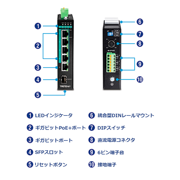 | 商品名 | 6ポート 高耐久産業用ギガビットPoE+ L2マネージド・DINレールスイッチ |