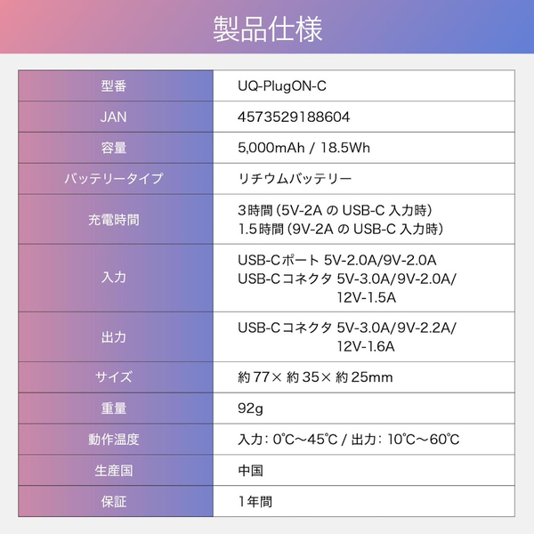 | 商品名 | VEGER TYPE-C コードレス ミニ パワーバンク 5000mAh 18.5W |