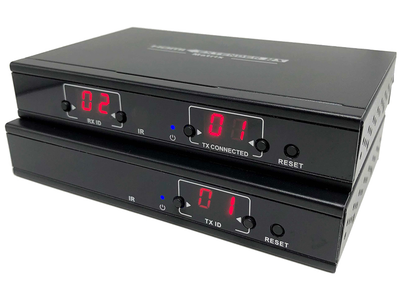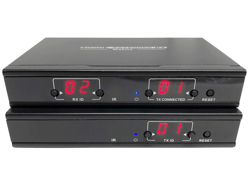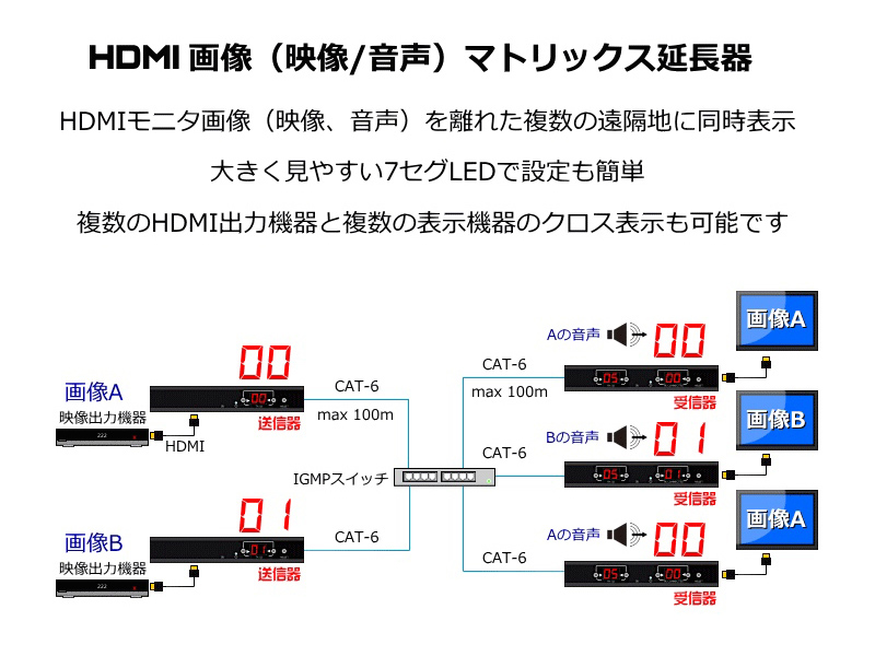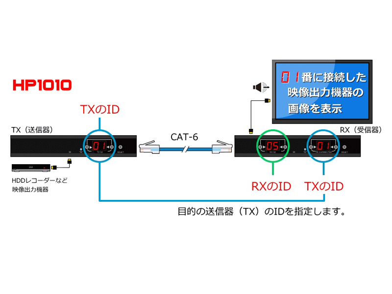 ●HP1010シリーズは複数のHDMI出力機器(PCおよびHDD/DVDレコーダー、TVチューナー、監視映像レコーダーなど)の画像を、最大240m離れた複数の場所に同時に表示します。ギガビットHUBを使用したマトリックスな接続が可能で、1:複数、複数:1、複数:複数など、様々な接続方式にも対応します。延長先の受信器で、表示させたいPC(または出力機器)に接続している送信器のIDを指定することで、目的の画像を表示、IDは送/受信器の前面のボタンか、付属のリモコンで簡単に設定できます。 ●延長にはLANケーブル(CAT-6)を使用します。HUBはギガビットハブ(IGMPスヌーピング)を推奨。(※ハブをカスケードしての長距離延長はお奨めしておりません。また、社内ネットワークに使用しているハブに複数接続して使用することは推奨いたしません。) ●延長距離は、1:1で120m、中間にハブを経由して最大240m延長できます。 ●HP1010シリーズは、離れたTVチューナーやDVDプレーヤーなどのチャンネル切り替え等も行えます。赤外線リモコンで操作できるソース機器であればほぼすべての操作が可能です。またRS232Cも搭載しており、遠隔地のRS232Cをもつデバイスを、手元で操作できます。