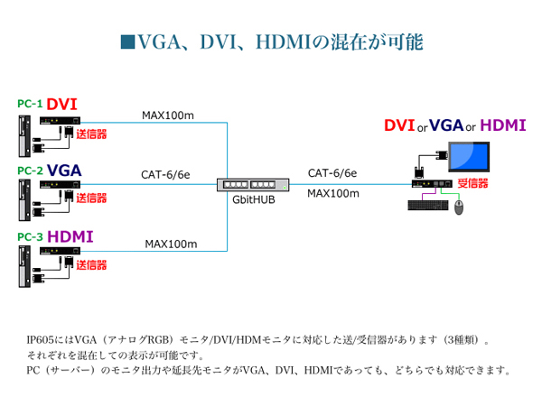 ●IP605シリーズは、複数のPCを遠隔地から切替えて操作するKVM切替延長ユニットです。PC複数:1はもちろん、1台のPCを複数のKVMで共有することができます。 ●延長にはLANケーブル(CAT-6/6e)を使用します。HUBはギガビットHUBハブを推奨。距離は、送信器からHUB間、HUBから受信器間はそれぞれ最大100mです(合計200m)。 ●IP605シリーズは1台のPCを複数ヶ所のモニタ/マウス/キーボードで遠隔操作することもできます。ロータリースイッチを使って送信器、受信器を同じナンバーにすることで、それぞれの受信器は常時同じ送信器を自動的に選択します。 ●操作側(受信器)にはUSBデバイス用ポートが付いており、USBメモリ、USBHDD、USBプリンタなど、キーボード/マウス以外のUSB機器が接続できます。また、RS232Cを搭載していますので、232Cを持つデバイスの通信が可能です。 ●IP605にはVGA(アナログRGB)/DVI/HDMモニタに対応した送/受信器があります(3種類)。それぞれを混在しての表示が可能です。PC(サーバー)のモニタ出力や延長先モニタがVGA、DVI、HDMIであっても、どちらでも対応できます。