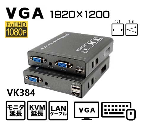●VK384は市販のLANケーブルを利用して、VGAモニタ、マウス、キーボードを遠隔地へ延長するエクステンダーです。「VK384-TR」は送受信器セット、「VK384-R」は増設用の受信機単体です。●1:1直結の場合、CAT-5e使用時で最大150m、CAT-6使用時で最大200mまで延長します。ハブを経由する場合は最大400m延長します(ハブの仕様にご注意ください)。●モニタ解像度はフルHD(1920×1080/60Hz)に対応(延長先での画質調整不要)●1対1はもちろん1対多の接続(最大15カ所)が可能で、遠隔地から同時操作できます。●TXにはローカルモニタ出力ポートを搭載。●RX(受信器)のUSBポートには、マウス/KB以外のUSBデバイスの接続はできません。●機器構成の組合せによっては、Excelなどの表計算ソフトやWebページ上の表の横線にチラツキがあらわれる場合があります。●既設の社内、構内LANやWANなどとの混在はしないでください。あくまでもVK384専用のラインを構築してご利用ください。