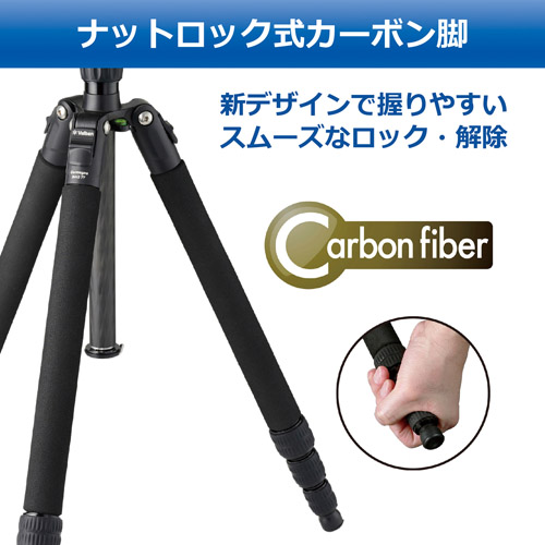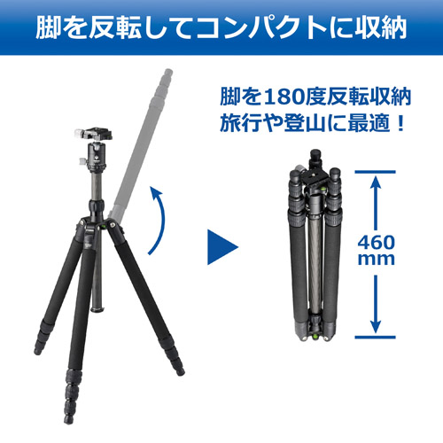 脚を180度反転してコンパクトに折りたためる反転収納機構を搭載したトラベルカーボン三脚。軽量で操作性の良いナットロック式カーボン4段脚を採用しました。 ■全高:約1470mm(EV含む)、約1216mm(EV含まず) ■EVスライド量:約254mm ■通常高/最低高:約550mm/約430mm ■縮長:約460mm ■段数/脚径:4段、約24/20/16/12mm ■質量:約1360g ■推奨積載質量:2.5kg(脚最大荷重10kg) ■雲台詳細:自由雲台、クイックシューQB-V20 ■本体・脚部詳細:脚反転機構、カーボンファイバーパイプ、ナットロック式、ゴム石突 ■付属品:三脚ケース、雲台止めねじアダプター、工具類 ■発売日:2022年6月