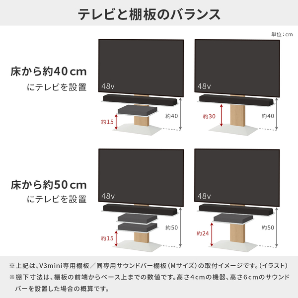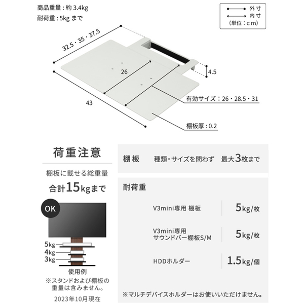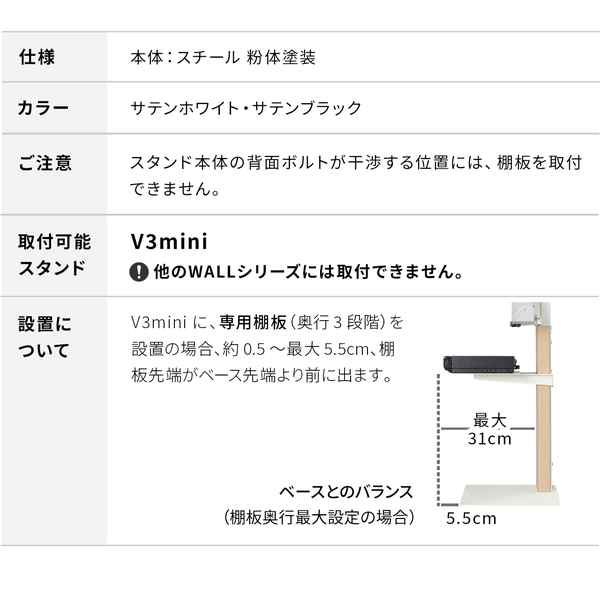 スマート&スモールなテレビスタンド「WALL V3COMPACT/mini」対応のレコーダー棚板オプション。レコーダーやゲーム機などの設置にスタンドのフロントパネル部分に取り付けることができる棚板。取り付けはテレビを取り付けた状態でも可能。高さはフロントパネルの範囲で無段階に設定できます。棚板の耐荷重は棚板全体で5kg。レコーダーやゲーム機をすっきりと設置できます。設置する機器の奥行に合わせて棚板の取付位置を前後に3段階調整できます。棚板やサウンドバー棚は合わせて3枚まで組み合わせて取り付けができます(合計耐荷重15kgまで)。サテンホワイトとサテンブラックの2色からお選びいただけます。塗装はテレビスタンドと同じ仕上げです。