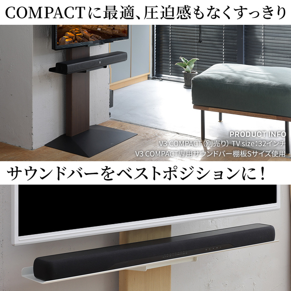 スマート&スモールなテレビスタンド「WALL V3COMPACT/mini」対応のサウンドバー棚板オプション。より臨場感のあるサウンドが楽しめるサウンドバー用の棚板です。スタンドのフロントパネル部分に取り付けることができ、取り付けはテレビを取り付けた状態でも可能。高さはフロントパネルの範囲で無段階に調整できます。押し付けて固定するのでネジ穴もなく美しく設置できます。棚板の耐荷重は10kg(2サイズ共通)。専用棚板と組み合わせて取り付けができます。棚類は合計3枚(合計耐荷重15kg)まで可能。サウンドバーの幅に合わせてSサイズ(幅60cm)とMサイズ(幅95cm)とから選べます。サテンホワイトとサテンブラックの2色からお選びいただけます。塗装はテレビスタンドと同じ仕上げです。