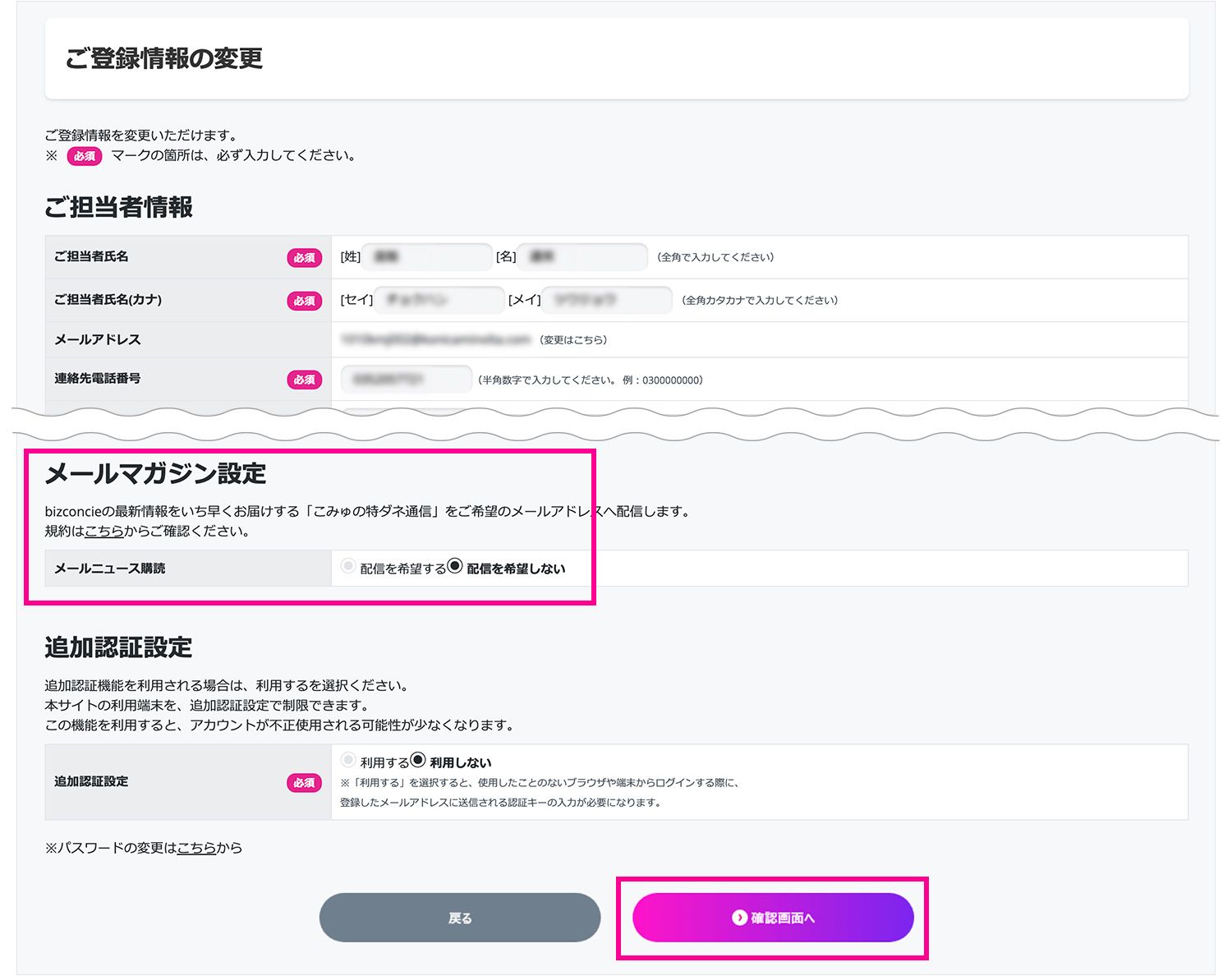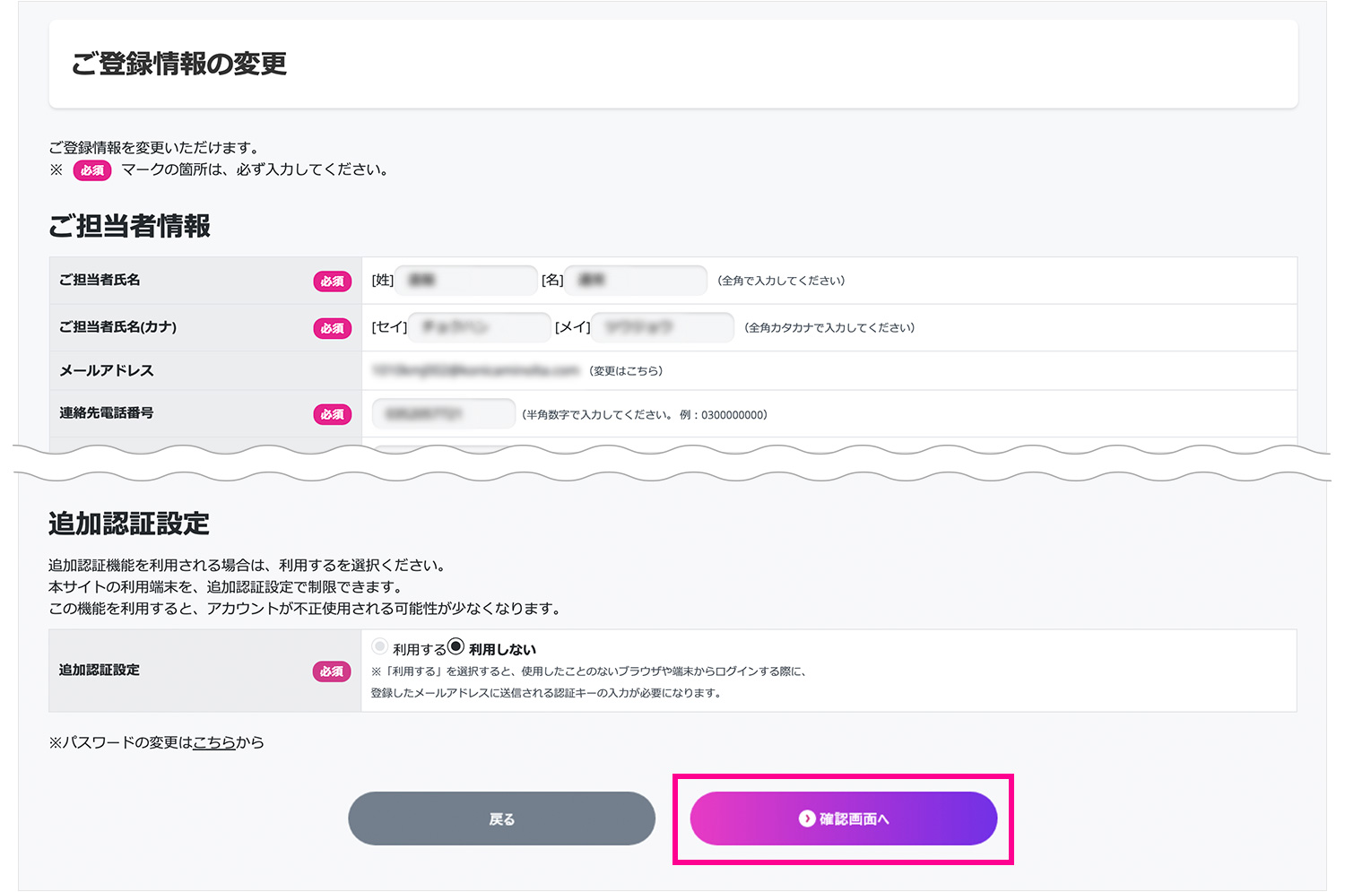 (2) 変更箇所を記入し、「確認画面へ」をクリックしてください。