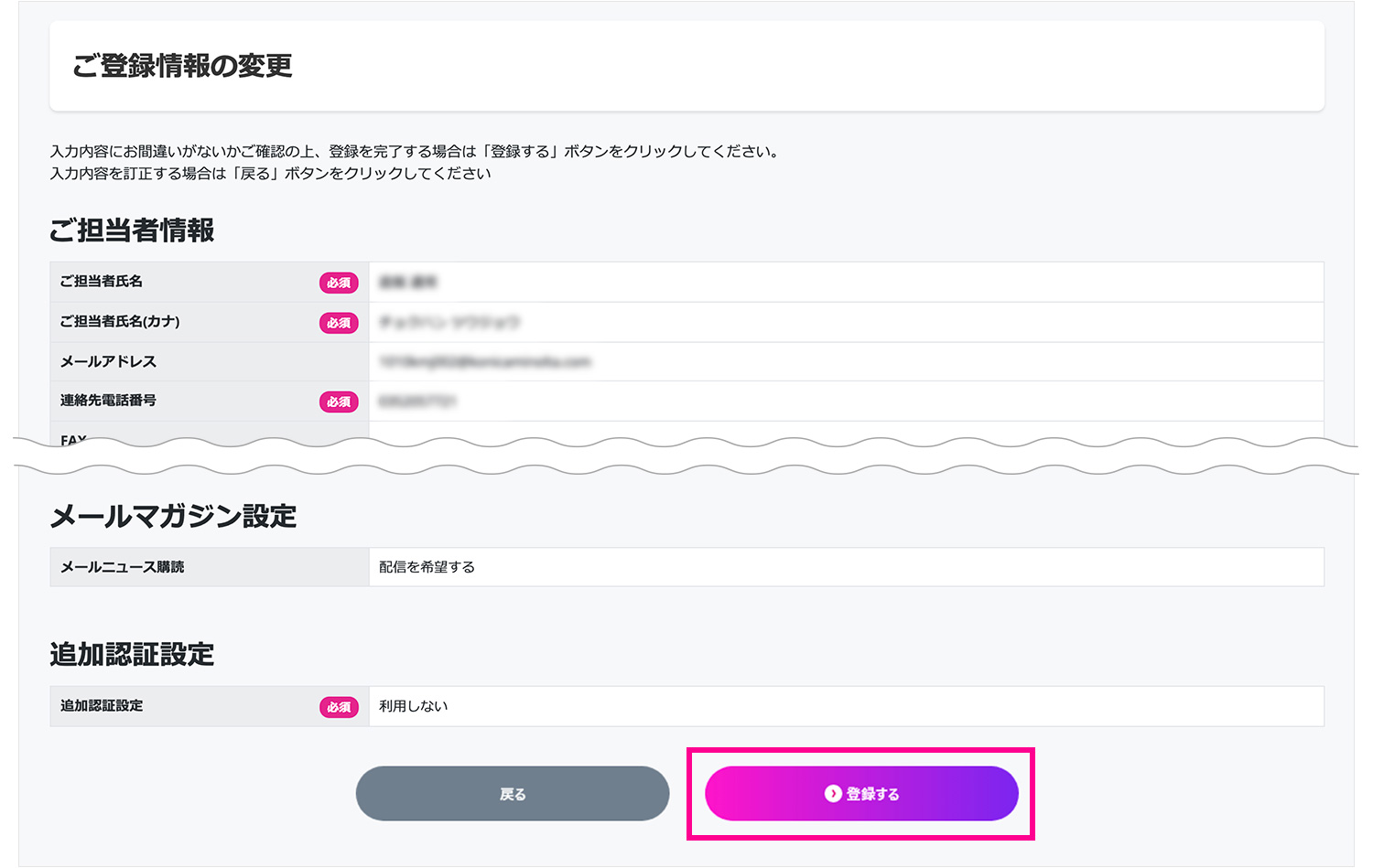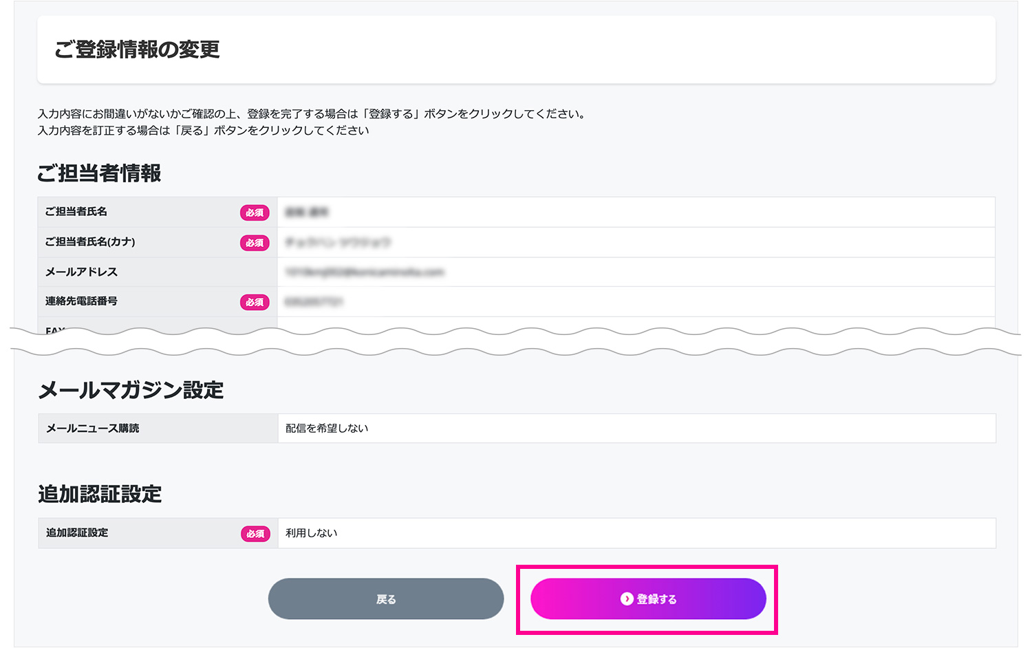 (3) 確認画面をご確認いただき、「登録する」をクリックしてください。