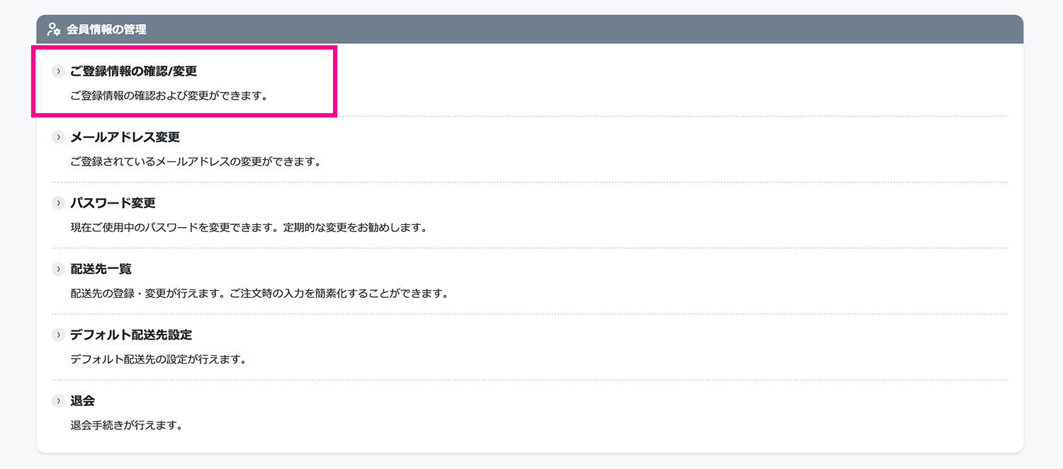(1) 「マイページ」へアクセスし、「会員情報の管理」内の「ご登録情報の確認/変更」をクリックしてください。