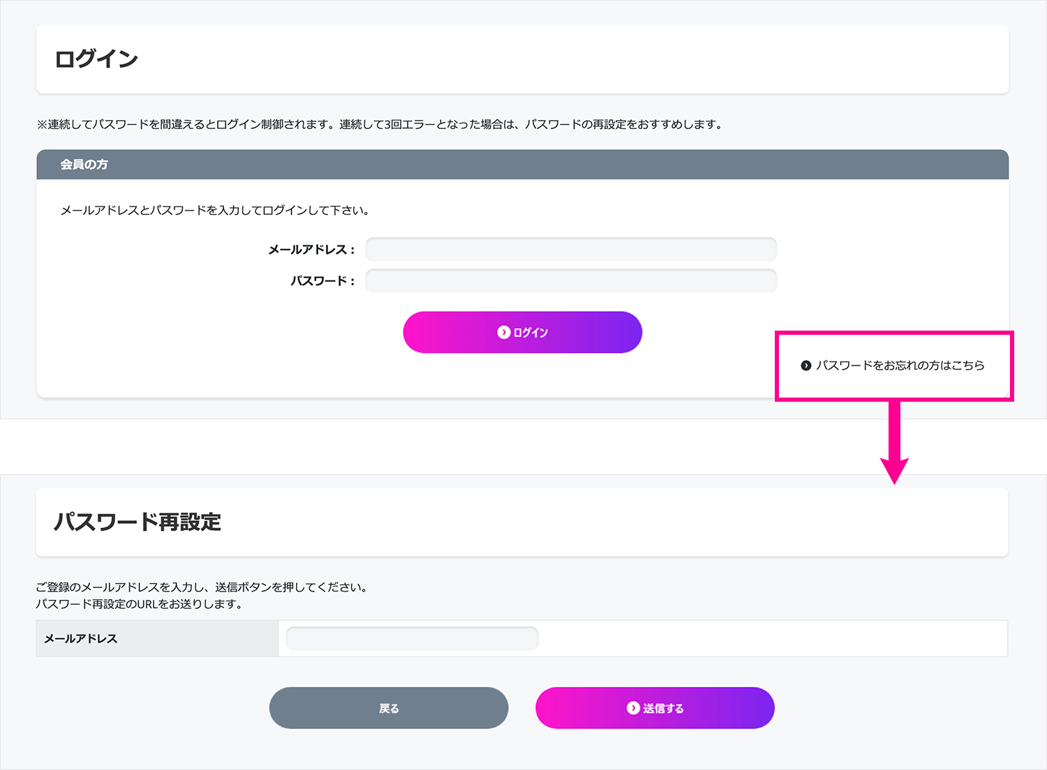 ログイン時のメールアドレスをお忘れの方は、「お問い合わせフォーム」よりご連絡ください。