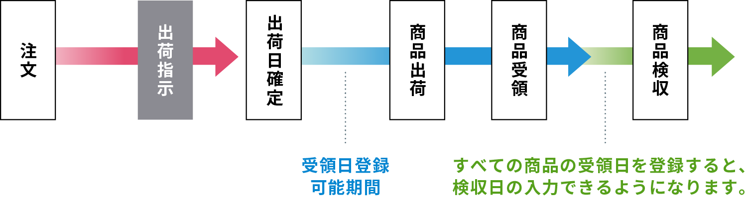 「検収日」は、注文内のすべての商品の「受領日」が登録された後に、入力できるようになります。