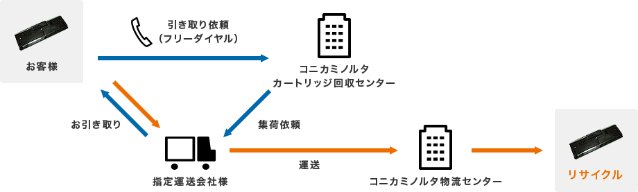 コニカミノルタ製カートリッジ・ドラムカートリッジはご使用後、新品のカートリッジを取り出した箱に入れていただき、弊社回収センターまでお電話(フリーダイヤル)ください。お客様のところまで、指定業者が回収にお伺いします。カートリッジの箱が無い場合は、極力小さい箱にお入れください。